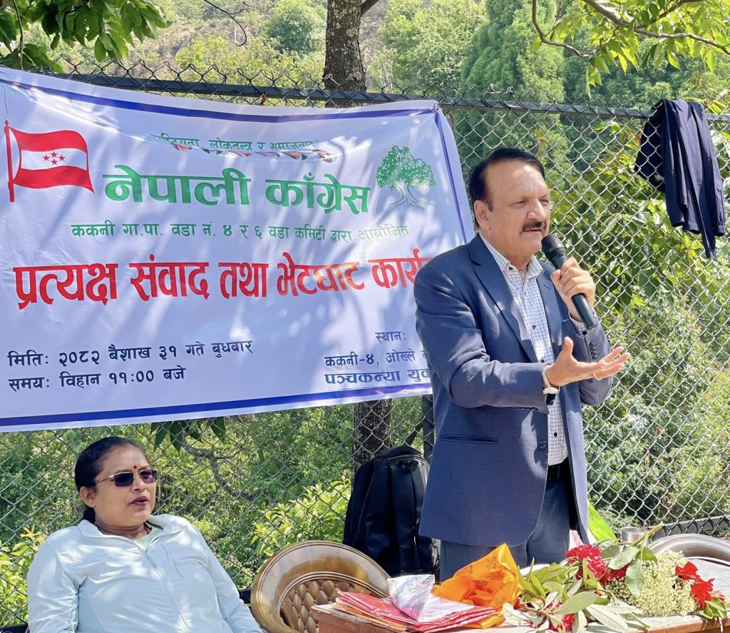 नेपाली कांग्रेस ककनी गाउँपालिका–४ र ६ नं वडा कार्यसमितिले आज ओख्लेमा आयोजना गरेको ‘प्रत्यक्ष संवाद तथा भेटघाट’ लाई सम्बोधन गर्दै प्रवक्ता डा महतले कृषि उत्पादन वृद्धि गर्दै पर्यटन भित्र्याउन सके त्यसबाट आउने आर्थिकोपार्जनबाट देशलाई समृद्धितर्फ लैजान सकिने बताउनुभयो ।