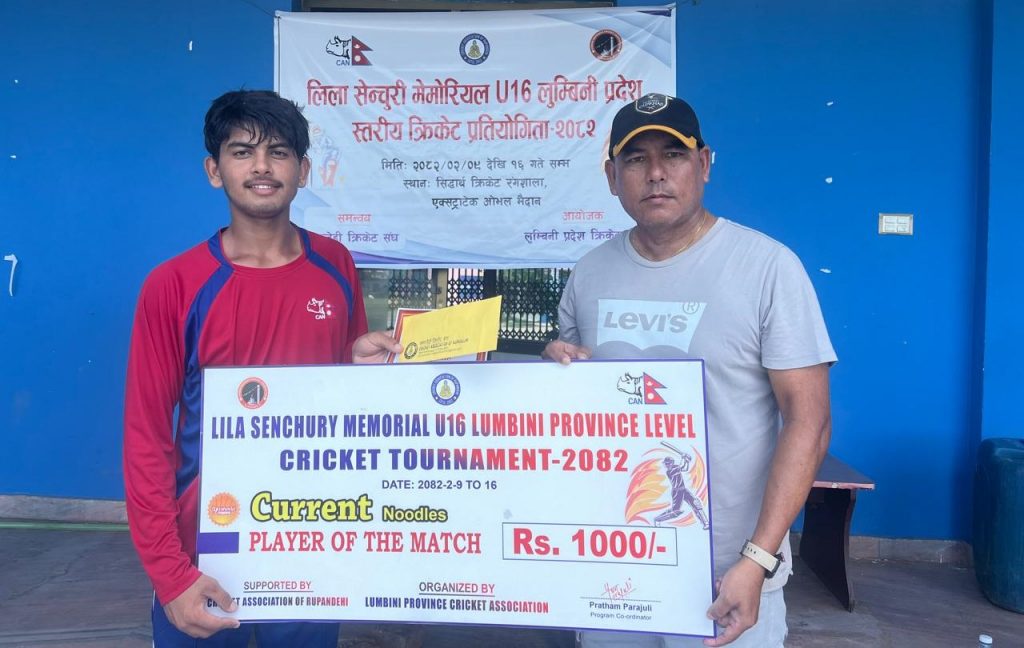रुपन्देही । रुपन्देहीमा जारी लीला सेन्चुरी मेमोरियल यु–१६ लुम्बिनी प्रदेश स्तरीय क्रिकेट प्रतियोगितामा रुपन्देही र बाँके विजयी भएका छन् । रुपन्देहीले कपिलवस्तुलाई ७ विकेट र बाँकेले बर्दियालाई ३ विकेटले पराजित गरेका हुन् ।