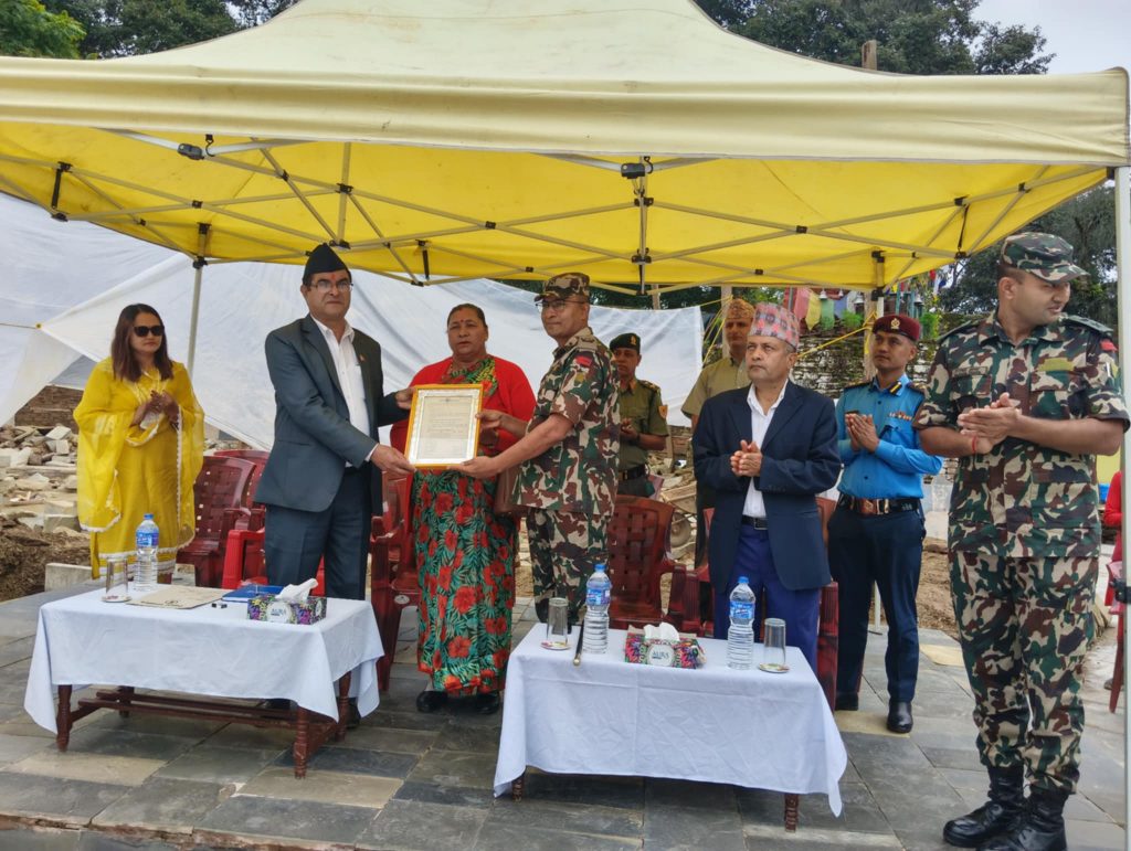 नेपाली सेनाको अर्जुन बाण गण दह ब्यारेक डडेल्धुराले झन्डै २५ लाखमा निर्माण सम्पन्न गरेको योजनाको फायल तथा प्रमाणपत्र सोमबार एक औपचारिक कार्यक्रमका बिच सुदूरपश्चिम प्रदेशका पृतनापति माधव थापाले अमरगढी नगरपालिकालाई हस्तान्तरण गर्नुभएको छ ।
