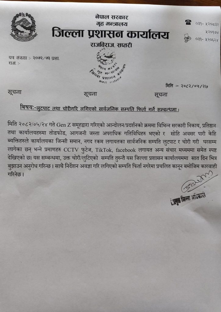 जेनजी आन्दोलनका क्रममा लुटिएका सामान फिर्ता गर्ने सप्तरी प्रशासनको ७ दिने अल्टिमेटम