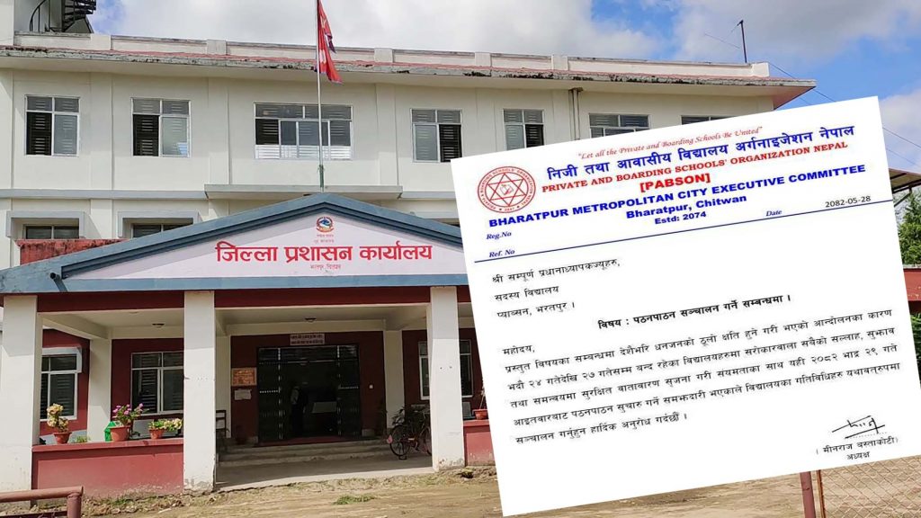त्यस्तै निजी तथा आवासीय विद्यालय अर्गनाइजेसन नेपाल (प्याब्सन) को भरतपुर महानगर कमिटीले एक सूचना जारी गरी आइतबारदेखि विद्यालय सञ्चालन हुने जानकारी दिएको छ ।