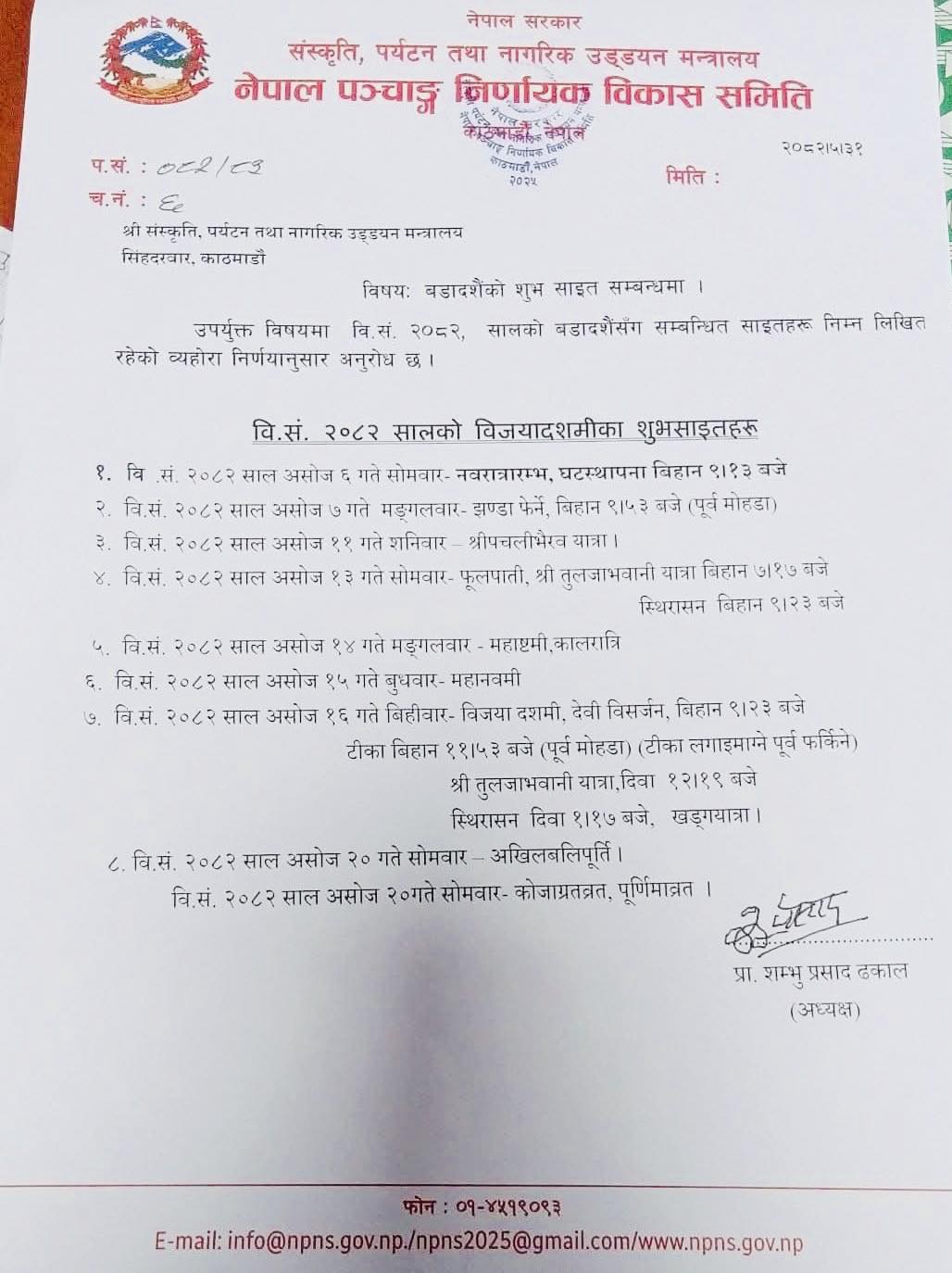 नेपाल पञ्चाङ्ग निर्णायक विकास समितिका अध्यक्ष प्रा. शम्भुप्रसाद ढकालले हस्ताक्षर गरी जारी गरेको सूचनामा यस वर्षको दशैंमा देवी विसर्जनदेखि टीका, जमरा ग्रहणसम्मको सबैजसो धार्मिक कर्मकाण्ड शुभ साइतमा गर्न सकिने जनाइएको छ ।