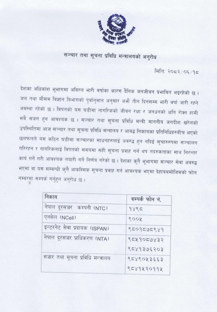 काठमाण्डौ । सञ्चार तथा सूचना प्रविधि मन्त्रालयले आफ्ना मातहतका सबै निकायहरुलाई सम्भावित विपद् जोखिमबाट जनधनको क्षति न्यून गर्ने गरी तयारी गर्न निर्देशन दिएको छ ।