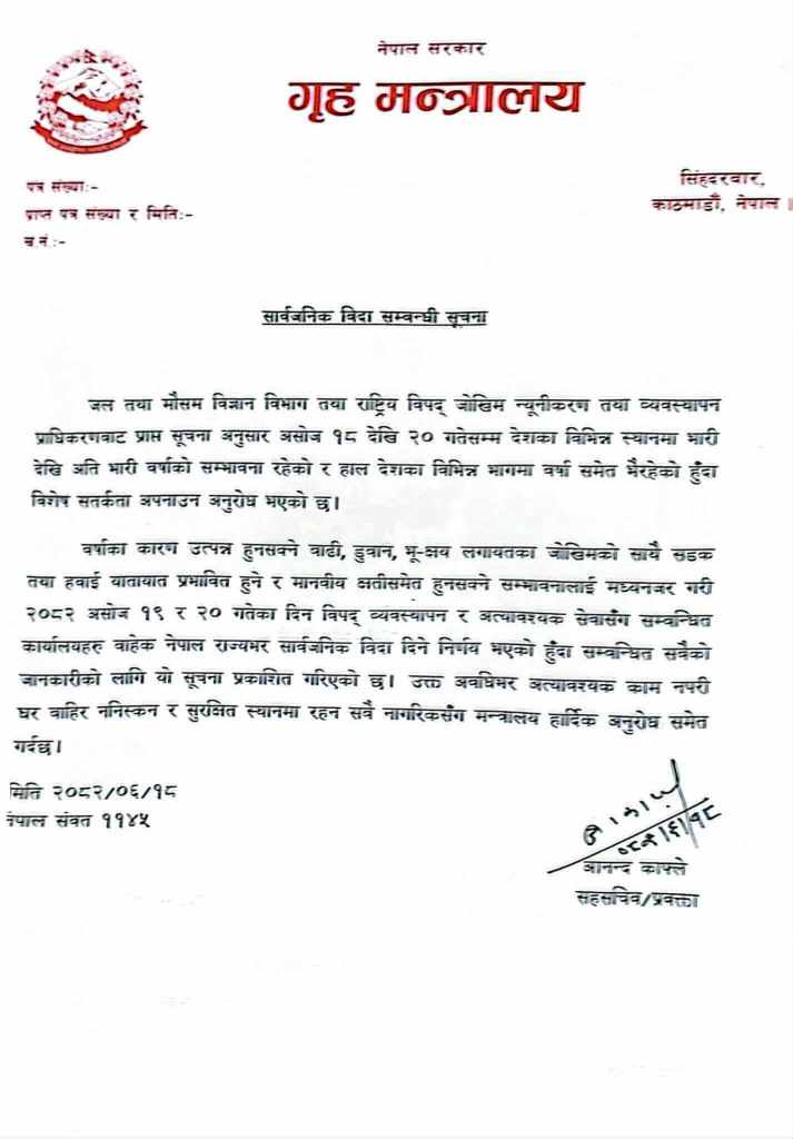 निरन्तर बर्षाका कारण देशभरका सडक मार्ग तथा हवाई मार्ग अवरुद्ध भएकाले मानवीय क्षति हुन सक्ने सम्भावनालाई मध्यनजर गर्दै दुई दिन सार्वजनिक बिदा दिने निर्णय गरेको गृहमन्त्रालयले जनाएको छ ।