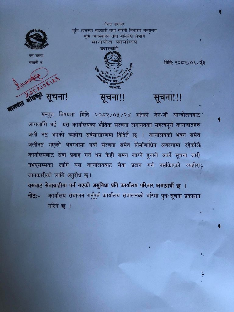 अभिलेख विभाग मालपोत कार्यालय कास्कीले जेन जी आन्दोलनबाट आगलागी भई कार्यालयका भौतिक संरचना लगायतका महत्त्वपूर्ण कागजातहरू जली नष्ट भएको छ । कार्यालयको भवन समेत जलीनष्ट भएको अवस्थामा नयाँ संरचना समेत निर्माणाधीन अवस्थामा रहेकोले, कार्यालयबाट सेवा प्रवाह गर्न थप केही समय लाग्ने हुनाले अर्को सूचना जारी नभएसम्मका लागि यस कार्यालयबाट सेवा प्रदान गर्न नसकिएको ब्यहोरा जानकारीको लागि अनुरोध छ। जारी सूचनामा भनिएको छ । यस अघि निकालिएको सूचना कास्कीका जग्गाधनीहरूले आफ्नो जग्गाको किटानी सिफारिस गर्नुपर्ने गर्नुपर्ने भनिएको थियो ।