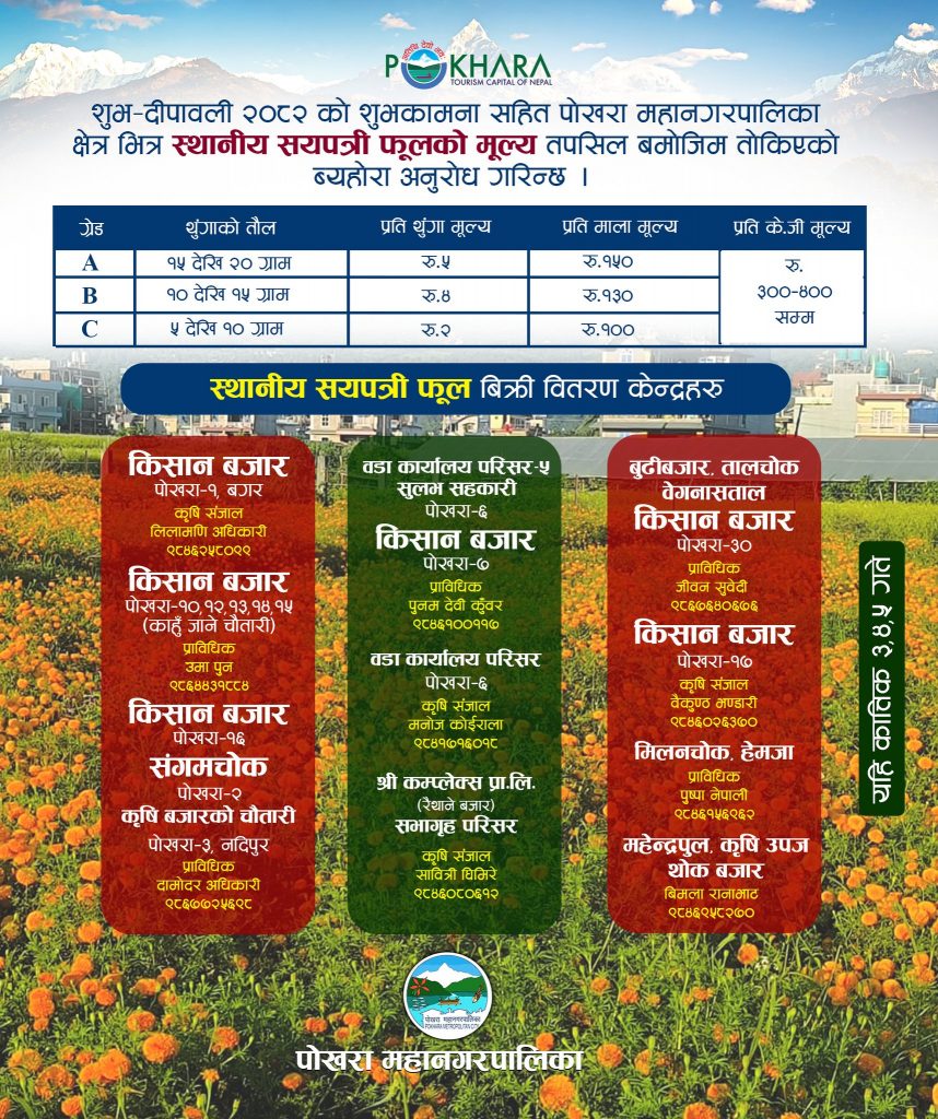 यस वर्ष पोखरा महानगर क्षेत्रका करिब २५ भन्दा बढी स्थानमा स्थानीय सयपत्री फूलको बिक्री केन्द्र तोकिएको छ । ती केन्द्रहरूमा यही कात्तिक ३, ४ र ५ गते फूल बिक्री हुनेछ ।