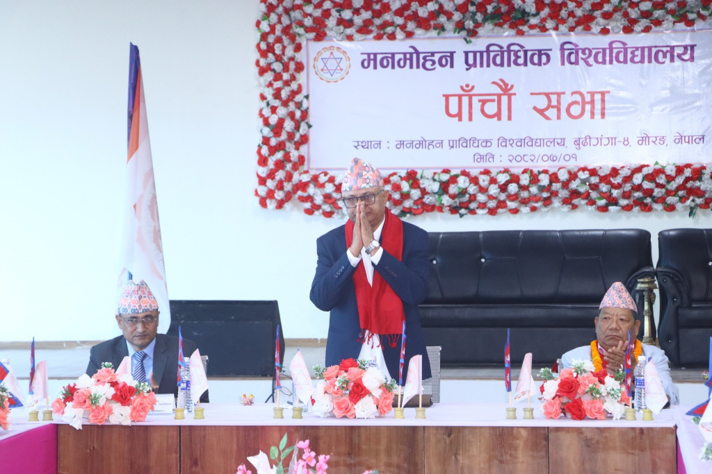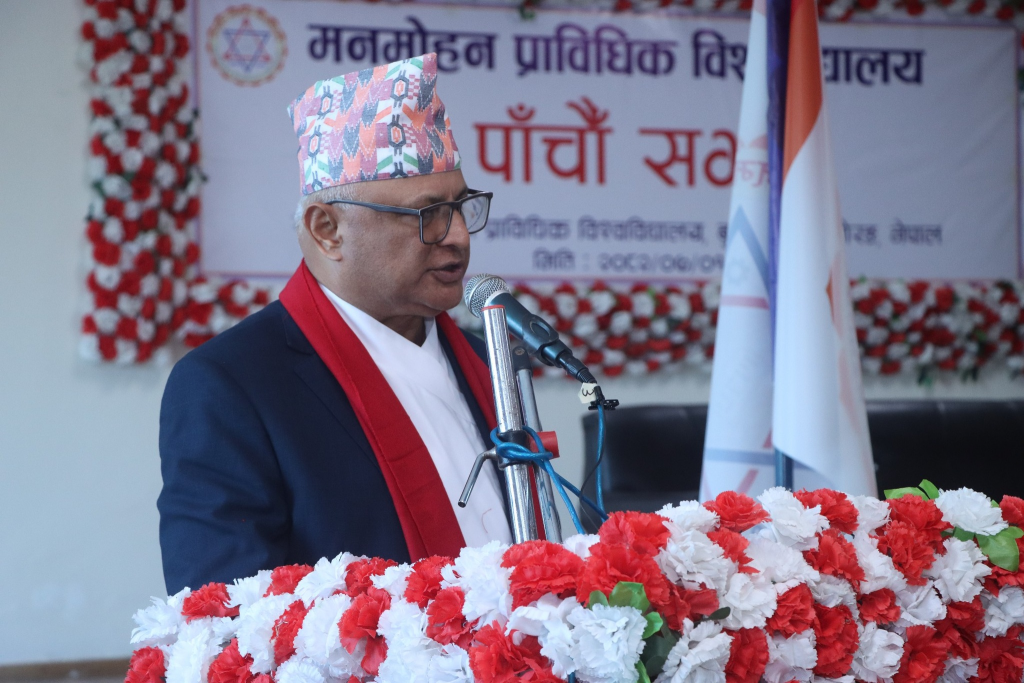 मोरङको बूढीगङ्गा गाउँपालिकास्थित मनमोहन प्राविधिक विश्वविद्यालयको पाँचौँ सभाको आज उद्घाटन गर्दै उहाँले शैक्षिक र उत्पादनमुलुक अनुसन्धान कार्यक्रमले मुलुकको समग्र विकास हुने भएकाले यसतर्फ विशेष ध्यान जानुपर्ने विचार राख्नुभयो ।