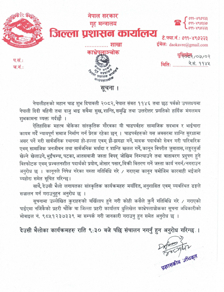 जिल्ला प्रशासन कार्यालय काभ्रेपलाञ्चोकका प्रशासकीय अधिकृतद्वारा जारी सूचनामा चाडपर्वका अवसरमा सामाजिक सद्भाव र भाइचारा कायम गर्दै मर्यादित र अनुशासित ढङ्गले सांस्कृतिक कार्यक्रम सञ्चालन गर्न आग्रह गरिएको छ।