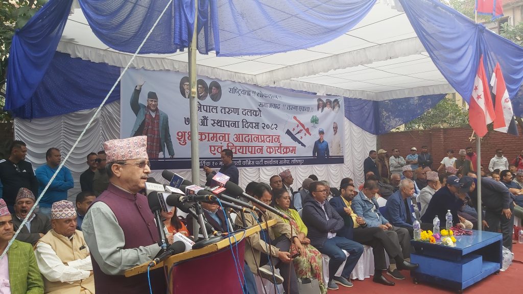 नेपाल तरुण दलको ७३औँ स्थापना दिवसका अवसरमा नेपाली काँग्रेसको केन्द्रीय कार्यालय सानेपामा आज आयोजित शुभकामना आदानप्रदान एवम् चियापान कार्यक्रममा उहाँले नेपाल इतिहासकै प्रतिकूल अवस्थामा उभिएको र काँग्रेस पार्टीसमेत प्रतिकूल अवस्थामा रहेको उल्लेख गर्दै देश जोगाउन सङ्कल्पसहित अगाडि बढ्न आग्रह गर्नुभयो ।