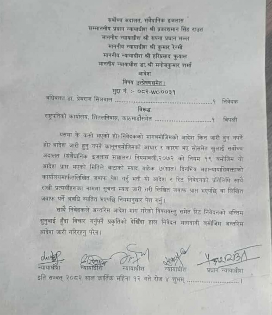 प्रतिनिधिसभा विघटनविरुद्ध परेको रिटमा सर्वोच्चद्वारा अन्तरिम आदेश दिन अस्वीकार