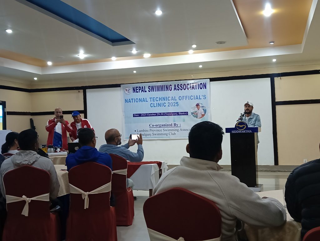 नेपालगञ्ज । बाँकेमा पौडी प्रशिक्षक तयार गर्न लागिएको छ । यही कार्तिक १४ र १५ गते नेपालगञ्ज रंगशाला परिसरको पौडी पोखरीमा आयोजना हुने दोस्रो नेपालगञ्ज नेशनल स्विमिङ च्याम्पियनसीपको पूर्व सन्ध्यामा २५ जना पौडी प्रशिक्षक तयार गर्न लागिएको हो । नेपालगञ्ज स्विमिङ क्लबले प्रशिक्षक तयार गर्दैछ । नेपाल पौडी संघका प्राविधिक प्रतिनिधि विष्णु खड्का, अनिष महर्जन र दीपक सागर सिंह सहितको टोलीले बुधबारदेखि दुई दिने प्रशिक्षण कार्यक्रम सञ्चालन गरेको क्लबका अध्यक्ष केशब न्यौपानेले बताउनुभयो ।