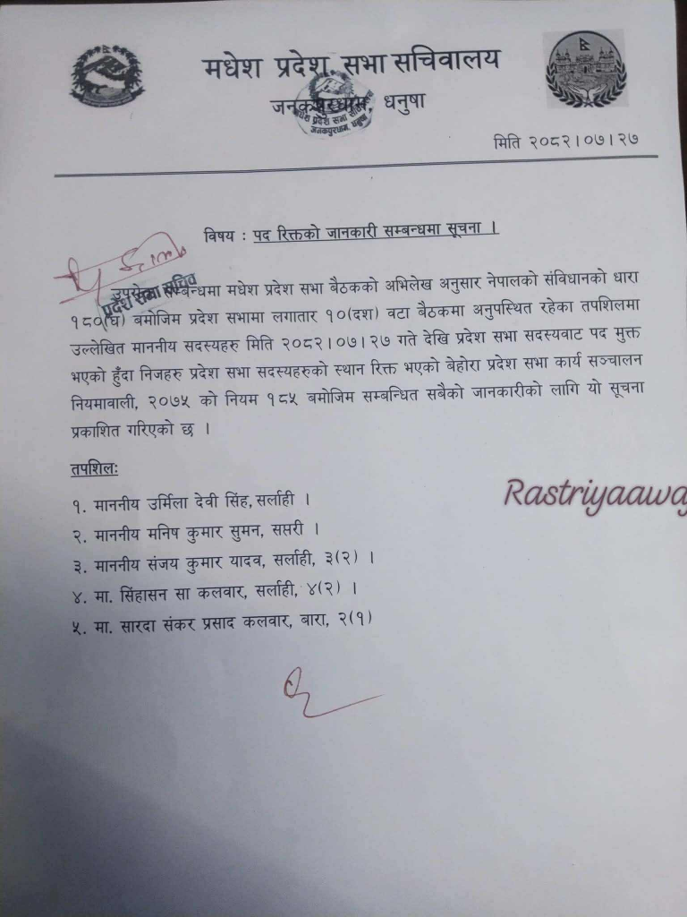 जनकपुरधाम । मधेश प्रदेशका सभामुख रामचन्द्र मण्डलले पाँच जना प्रदेशसभा सदस्यलाई पदमुक्त गर्र्नुभएको छ । प्रदेशसभा सचिवालयद्वारा जारी सूचनामा नेपाल संविधानको धारा १८० (घ) तथा प्रदेशसभा कार्यसञ्चालन नियमावली, २०७५ को नियम १८५ बमोजिम उनीहरूको पद स्वतः रिक्त भएको उल्लेख छ।