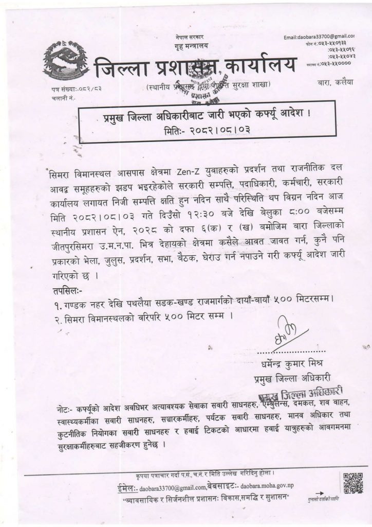 सिमरा विमानस्थल आसपास क्षेत्रमा जेनजी युवाहरूको प्रदर्शन र राजनीतिक दलसँग आवद्ध समूहबीच झडप बढ्दै गएपछि सुरक्षा जोखिम रोक्न जिल्ला प्रशासन कार्यालय बाराले कर्फ्यू आदेश जारी गरेको थियो ।