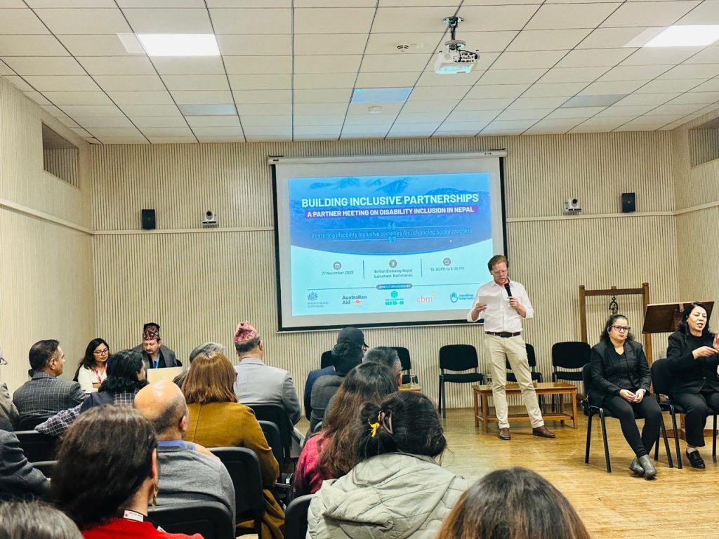 काठमाडौँ । नेपालमा अपाङ्गता समावेशी विकासलाई सुदृढ बनाउन दातृ निकाय र अपाङ्गता अधिकार संस्थाहरूबिचको विशेष बैठक ‘Building Inclusive Partnerships’ आज काठमाडौँस्थित ब्रिटिस दूतावास, लैनचौरमा सम्पन्न भएको छ। संयुक्त रूपमा British Embassy Kathmandu, Australian Aid, NFDN, CBM Global, र Handicap International को सहकार्यमा आयोजना गरिएको थियो।