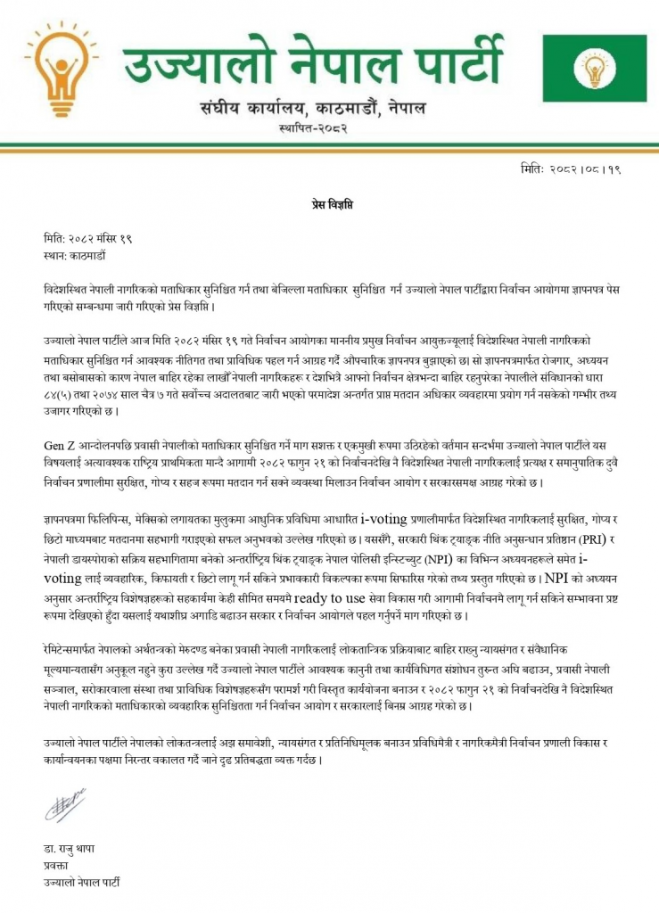 काठमाडौँ । उज्यालो नेपाल पार्टीले विदेश तथा आफ्नो निर्वाचन क्षेत्र बाहिर रहेका नेपाली नागरिकको मताधिकार सुनिश्चित गर्नुपर्ने माग गर्दै निर्वाचन आयोगमा आज ज्ञापनपत्र बुझाएको छ ।