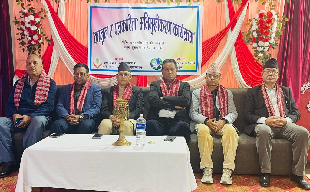 नेपालगन्ज । उच्च अदालत तुलसीपुर नेपालगन्ज इजलासका वरिष्ठतम् न्यायाधीश वामदेव ज्ञवालीले डिसइन्फर्मेसनबाट समाजलाई जोगाउन अति आवश्यक देखिएको बताउनुभएको छ । नेपाल पत्रकार महासङ्घ बाँकेको आयोजना तथा उच्च अदालत बार नेपालगन्ज र बाँके जिल्ला अदालत बार एसोसिएसनको सहकार्यमा आज नेपालगन्जमा आयोजना गरिएको ‘कानून र पत्रकारिता : अभिमुखीकरण कार्यक्रम’ को उद्घाटन गर्दै न्यायाधीश ज्ञवालीले डिसइन्फर्मेसन र मिसइन्फर्मेसनले समाजलाई दिग्भ्रमित गर्ने भएकोले पत्रकारहरूले सजग भएर समाचार सम्प्रेषण गर्नुपर्नेमा जोड दिनुभयो ।