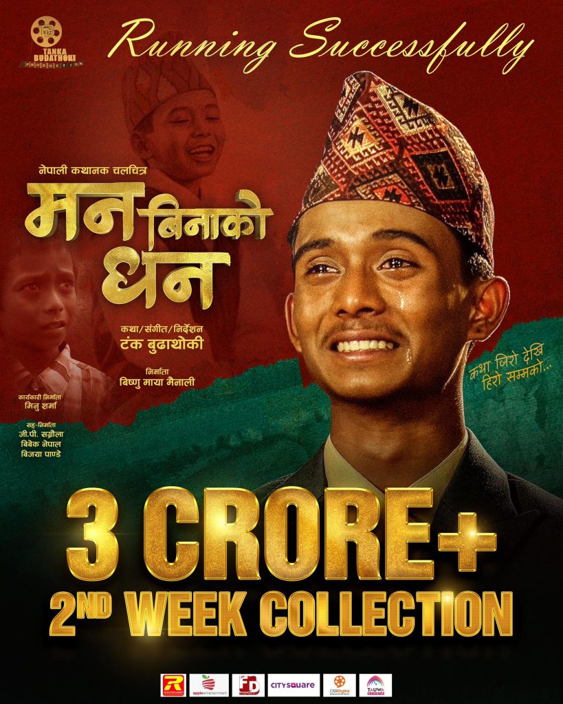बाल गायकका रुपमा परिचित हुनुभएका अशोक दर्जीको जीवनीमा आधारित रहेर तयार गरिएको चलचित्र ‘मनबिनाको धन’ ले सोही अवधिसम्म रु तीन करोड ७९ लाख दुई हजार ८७९ को व्यापार गरेको छ ।
