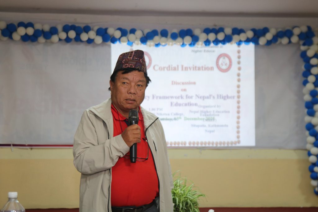 नेपाल उच्चशिक्षा प्रतिष्ठानका अध्यक्ष प्राध्यापक डा तीर्थराज खनियाले कार्यक्रमको उद्देश्य र सान्दर्भिकतामाथि प्रकाश पार्दै नेपालको उच्चशिक्षा प्रणालीलाई समयानुकूल सुधार गर्न नीतिगत स्पष्टता, संस्थागत स्वायत्तता र उत्तरदायी नेतृत्व अपरिहार्य रहेको बताउनुभयो ।