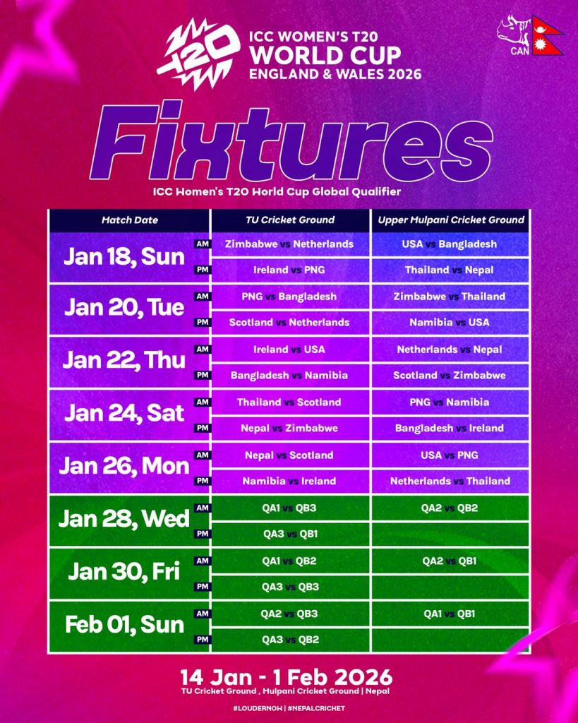 काठमाडौँ I नेपाल क्रिकेट सङ्घ (क्यान) ले नेपालमा आयोजना हुने आइसीसी महिला टी–२० विश्वकप ग्लोबल छनोटको खेल तालिका सार्वजनिक गरेको छ । उक्त प्रतियोगितामा विभिन्न १० राष्ट्रको सहभागिता रहेको छ ।