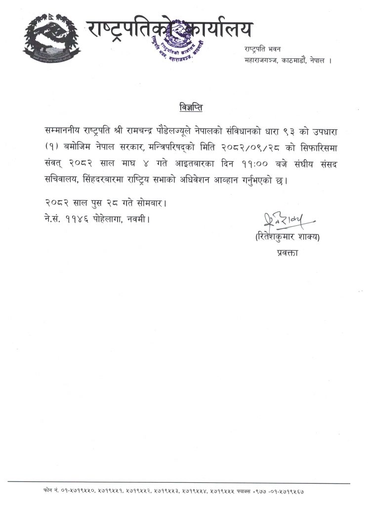 राष्ट्रपतिद्वारा राष्ट्रियसभाको अधिवेशन आह्वान