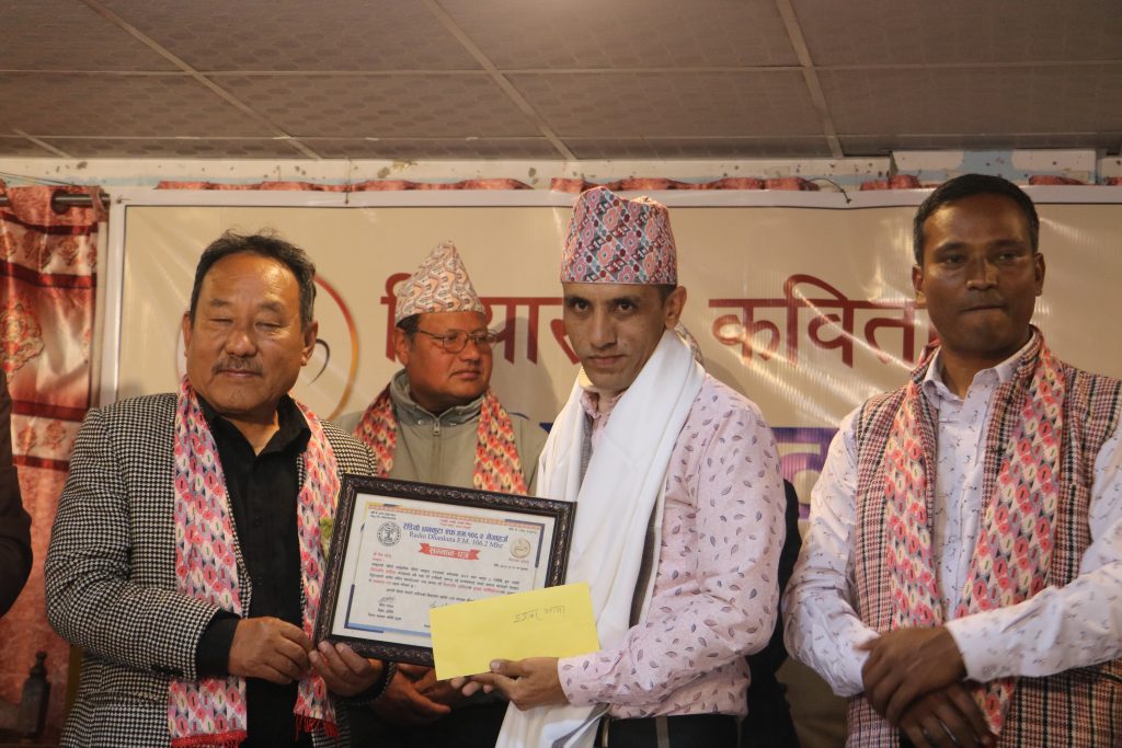 रेडियो धनकुटा एफएमको संयोजनमा हुँदै आएको चियासँग कविता कार्यक्रम पहिलो वार्षिकोत्सवको अवसरमा आयोजित कार्यक्रममा रेडियो नेपाल धनकुटा संवाददाता ईश्वर थापासहित अन्य ३ जना स्रष्टालाई सम्मान तथा पुरस्कृत गरेको हो ।