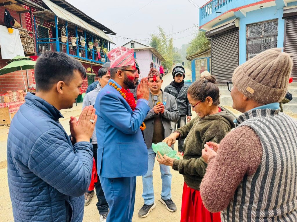 निर्वाचित भएपछि गाउँ पुगेर मतदातालाई धन्यवाद दिँदै भुसाल