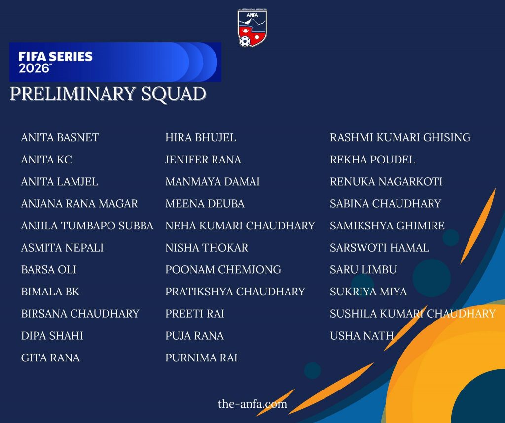 त्यसैगरी, निशा ठोकर, पूनम चेम्जोङ, प्रतीक्षा चौधरी, प्रीति राई, पूजा राना, पूर्णिमा राई, रश्मि कुमारी घिसिङ, रेखा पौडेल, रेनुका नगरकोटी, सबिना चौधरी, समीक्षा घिमिरे, सरस्वती हमाल, सरु लिम्बू, सुक्रिया मिया, सुशिलाकुमारी चौधरी र उषा नाथ छनोट भएको एन्फाले जनाएको छ ।