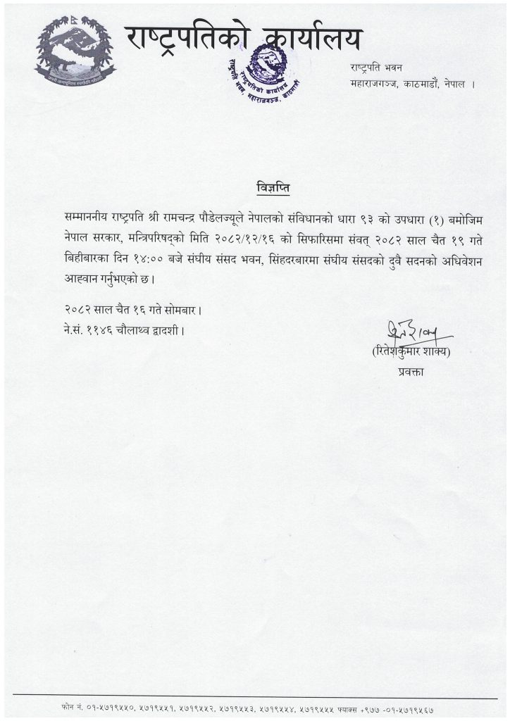 काठमाडौँ । राष्ट्रपति रामचन्द्र पौडेलले सङ्घीय संसद्को दुवै सदनको अधिवेशन आह्वान गर्नुभएको छ ।
