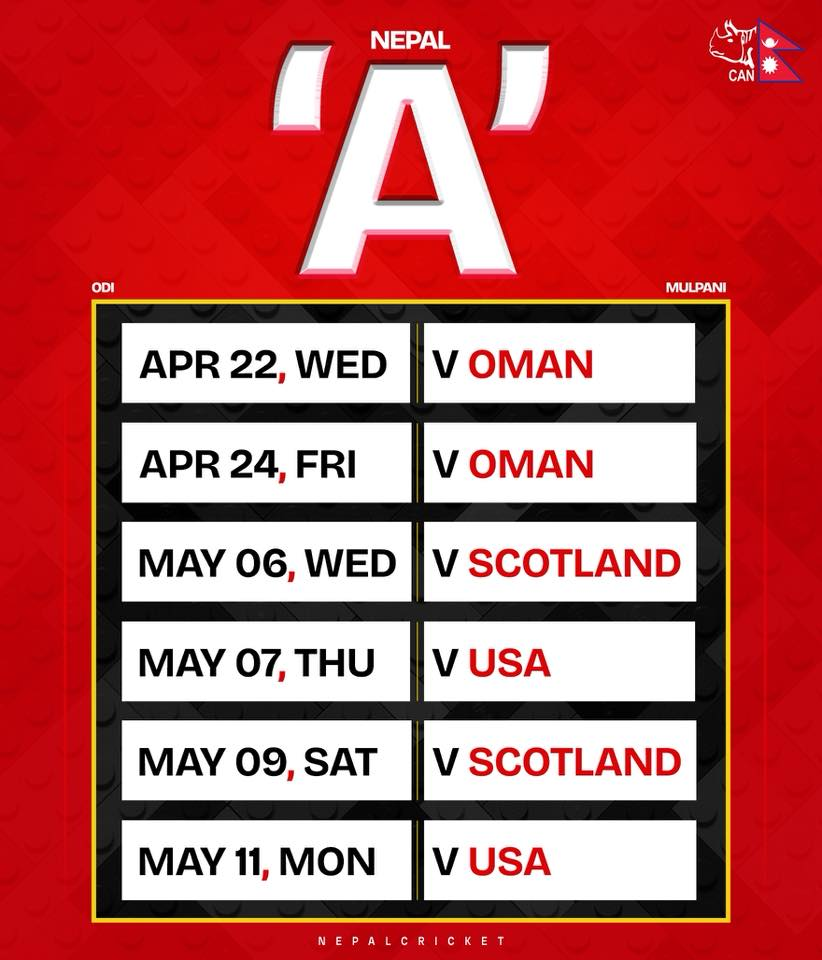 क्यानले सार्वजनिक गरेको खेलतालिका अनुसार नेपाल ‘ए’ ले पहिलो खेल ओमानसँग खेल्ने छ । ओमानसँगको दुई खेल अप्रिल २२ र २४ तारिखमा हुनेछ । त्यसैगरी मे ६ र ९ तारिखमा स्कटल्यान्डसँग खेल्ने र मे ७ र ११ मा अमेरिकासँग खेल्ने विज्ञप्तिमा उल्लेख छ ।