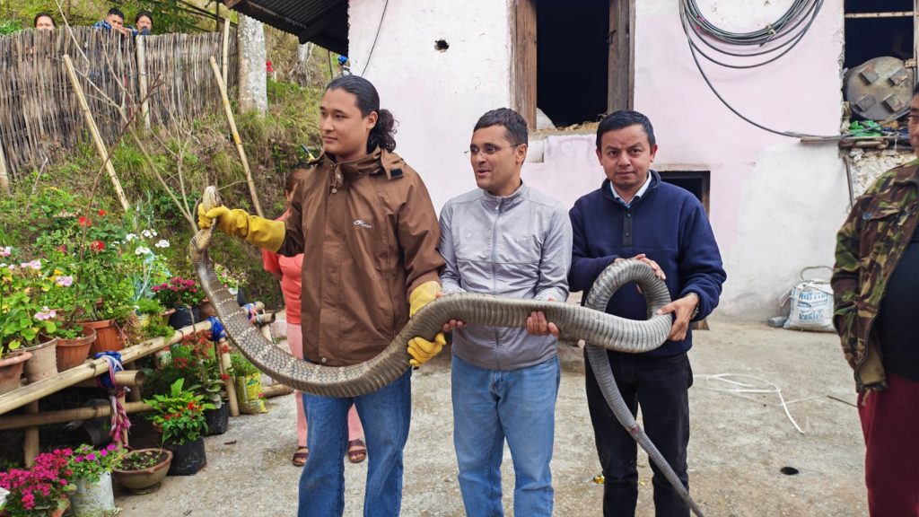 धनकुटा । धनकुटा नगरपालिका–३ र ६ को सिमाना कागते क्षेत्रबाट करिब १३ फिट लामो विषालु राजगोमन (किङ कोब्रा) सर्प उद्धार गरिएको छ ।