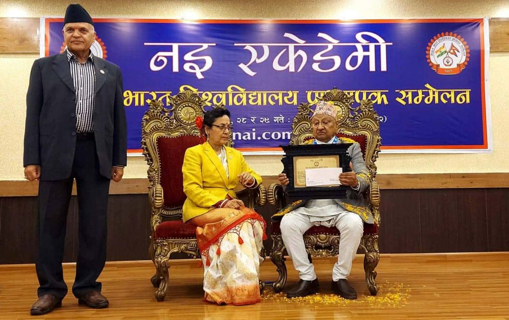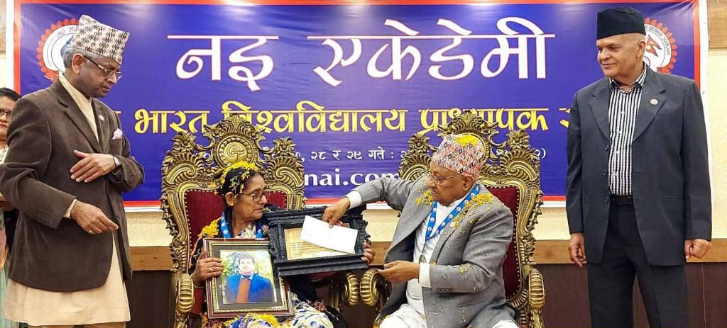 समारोहमा नइ एकेडेमीका कुलपति इन्दिरा प्रसाईँले समालोचक प्रा।डा।वासुदेव त्रिपाठीलाई ‘नइ प्रज्ञा पुरस्कार’ र ‘नेपाल भारत विश्वविद्यालय प्राध्यापक सम्मेलन पदक’बाट विभूषित गर्नुभयो ।