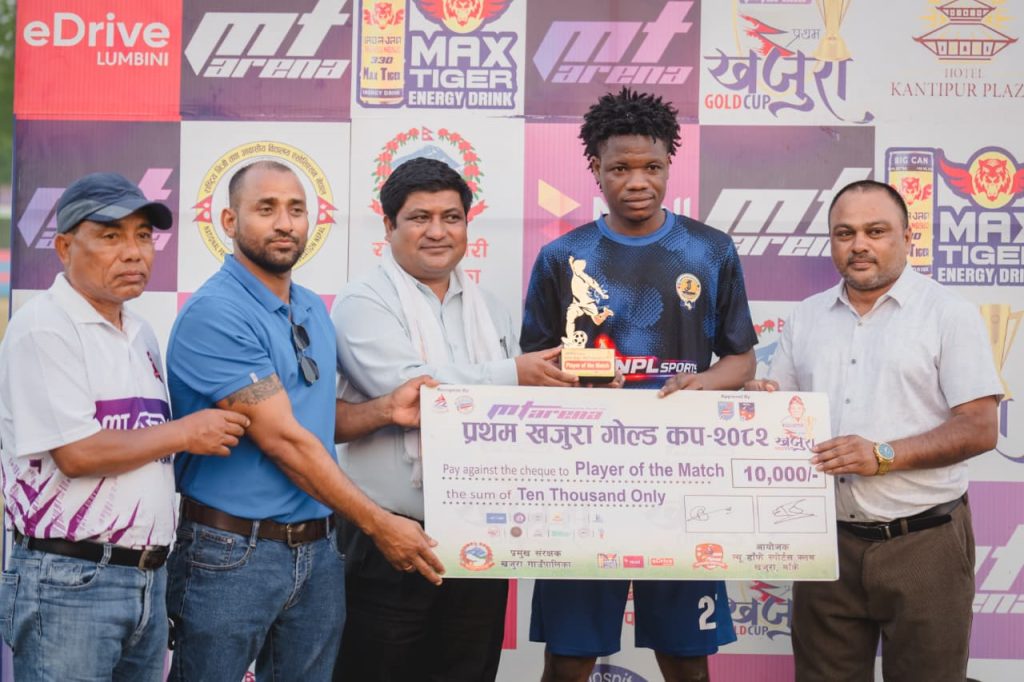 खेलका म्यान अफ द म्याच दुई गोल गरेका नाइजेरियन खेलाडी ताजुदिन अकिनसोलालाई खजुरा गाउँपालिकाका अध्यक्ष डम्बर बहादुर विकले १० हजार रुपैयाँसहित पुरस्कृत गर्नुभयो ।