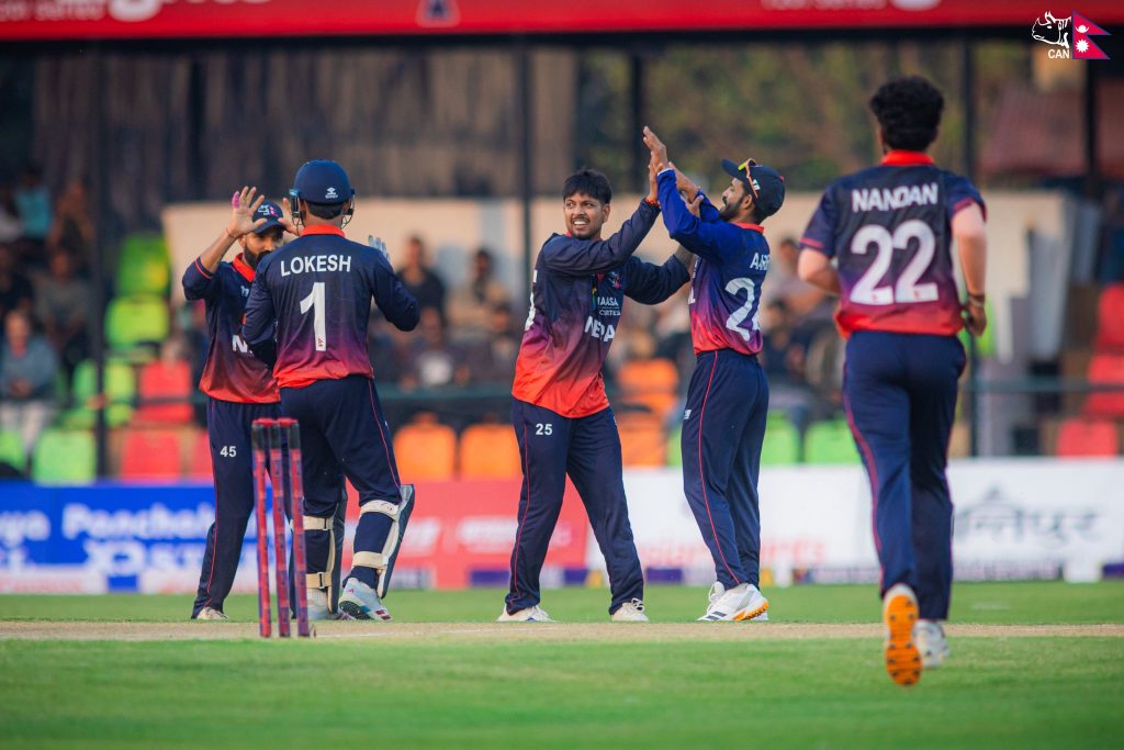 नेपालका लागि कुशल भुर्तेलको सर्वाधिक ८४, दीपेन्द्रसिंह ऐरीको २३, कुशल मल्लको १९ र सन्तेष यादवकाे १ रनको योगदान रह्यो ।