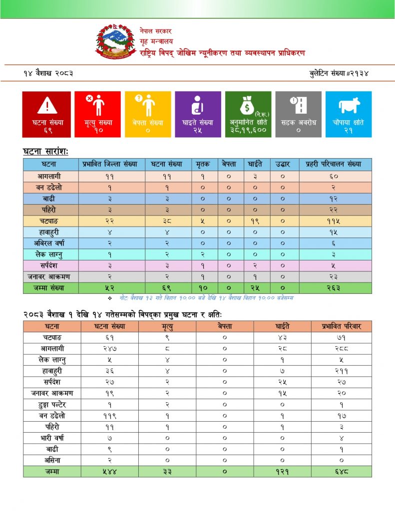 काठमाडौँ । विपद्जन्य घटनाबाट एकैदिन १० जनाको मृत्यु भएको छ ।