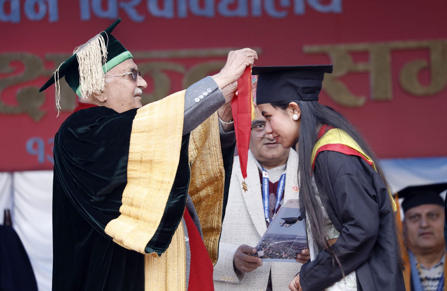 At a programme organized at Tripureshwor-based Dasharath Stadium, Prime Minister KP Sharma Oli presented certificates to students, who achieved the highest marks and those who completed their doctoral studies.