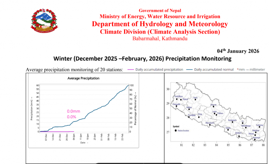 January 4, Kathmandu: Nepal has recorded no significant rainfall during the ongoing winter season, according to the latest winter rainfall monitoring report released by the Department of Hydrology and Meteorology (DHM).