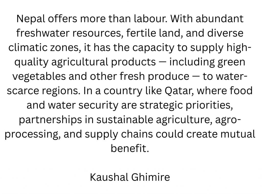 Nepal offers more than labour. With abundant freshwater resources, fertile land, and diverse climatic zones, it has the capacity to supply high-quality agricultural products — including green vegetables and other fresh produce — to water-scarce regions. In a country like Qatar, where food and water security are strategic priorities, partnerships in sustainable agriculture, agro-processing, and supply chains could create mutual benefit.