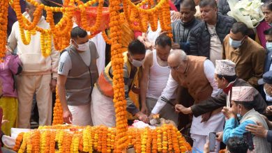 Kathmandu: The late Mohan Prasad Oli, father of CPN-UML Chairman and former Prime Minister KP Sharma Oli, was laid to rest today at Pashupati Aryaghat. Chairman Oli lit a lamp on his father’s body as part of the last rites.