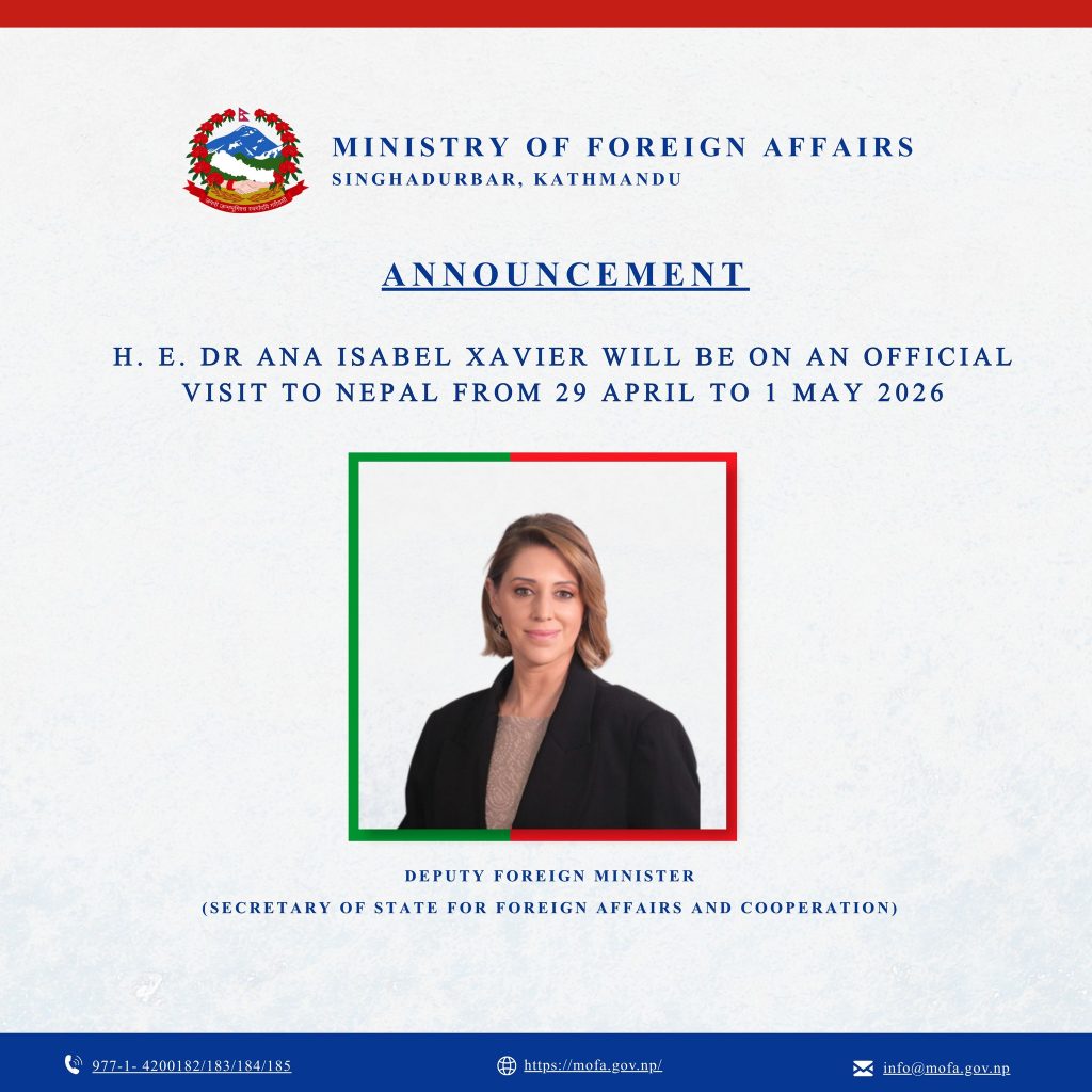 Kathmandu: Deputy Foreign Minister (Secretary of State for Foreign Affairs and Cooperation of Portugal) Dr Ana Isabel Xavier will be on an official visit to Nepal from 29 April to 1 May 2026.